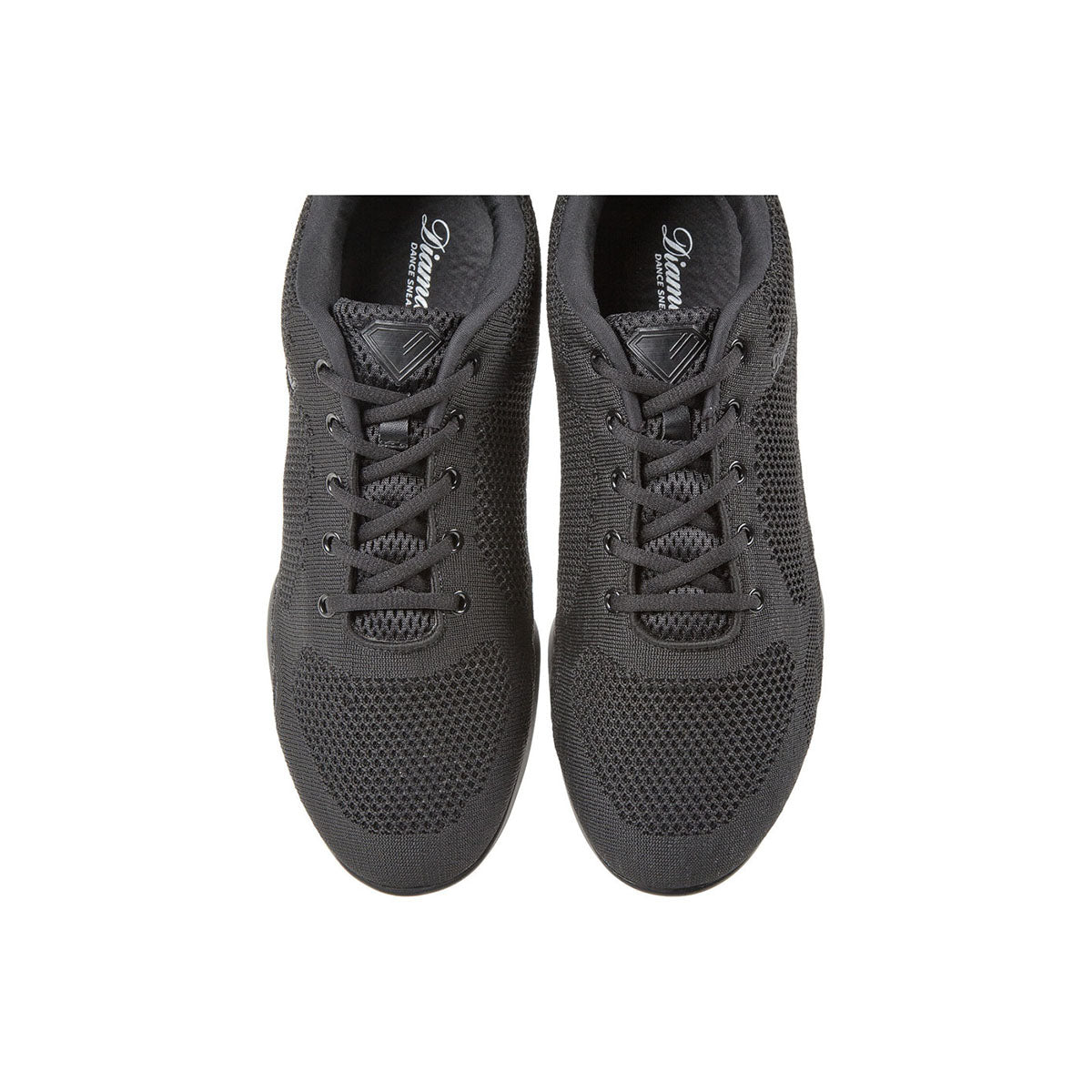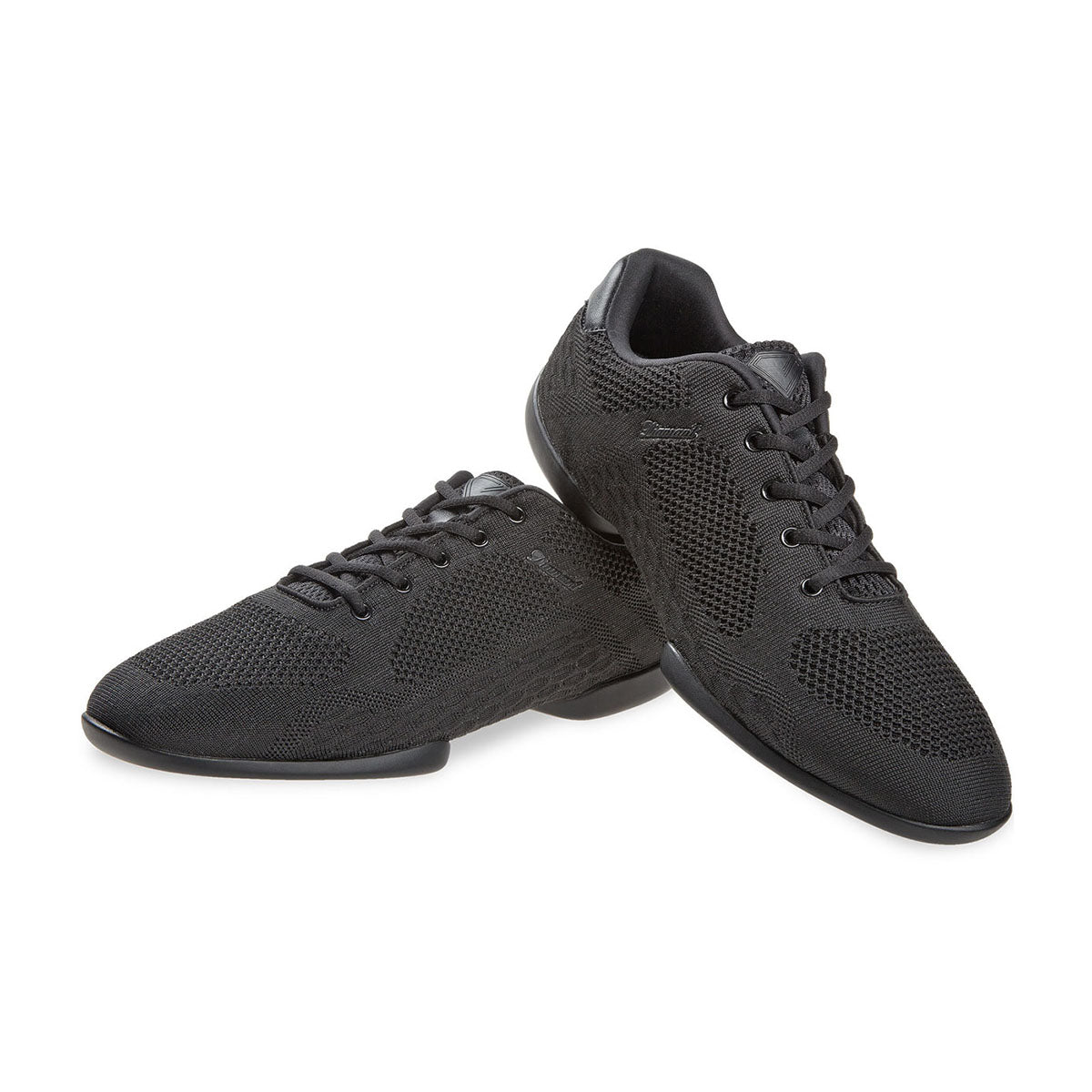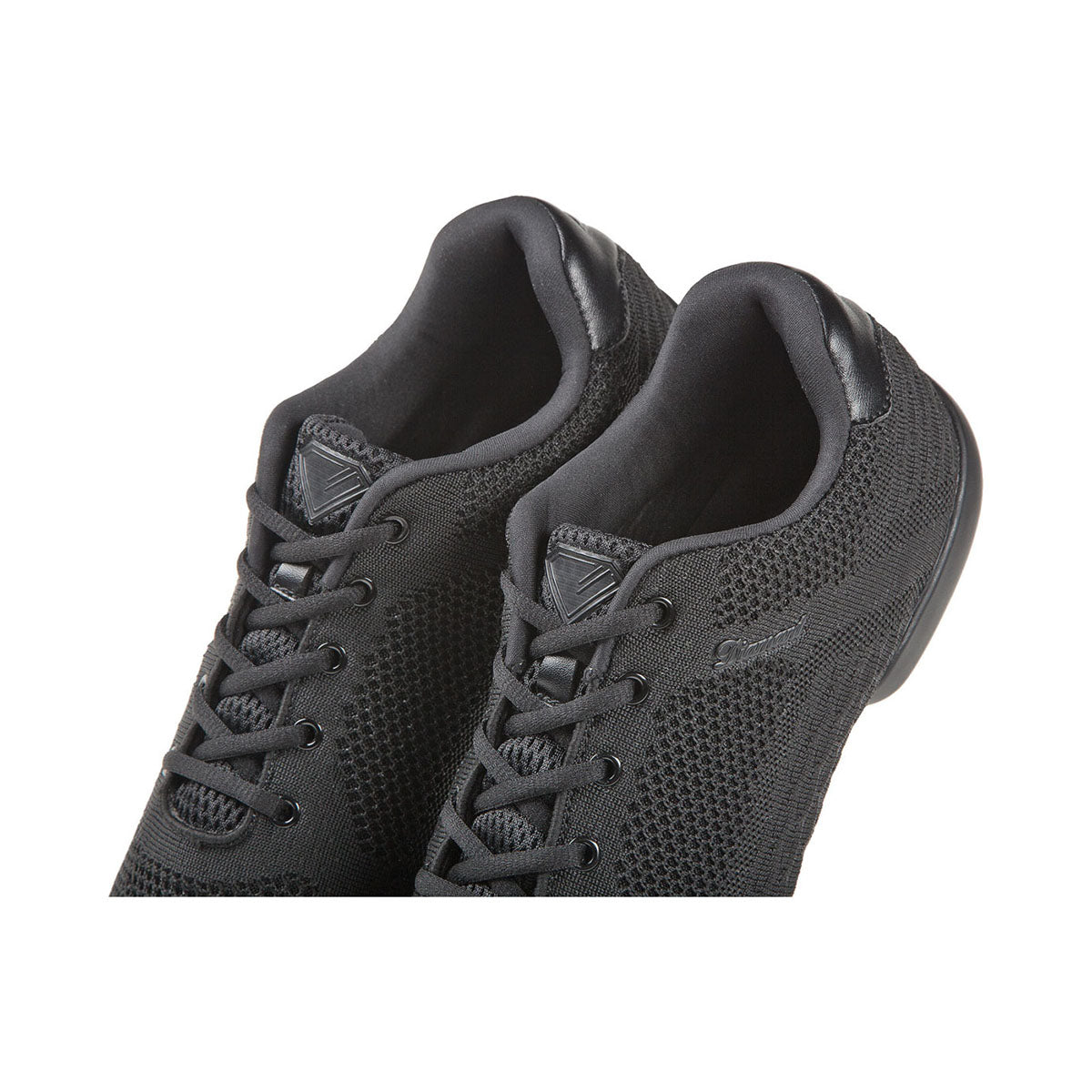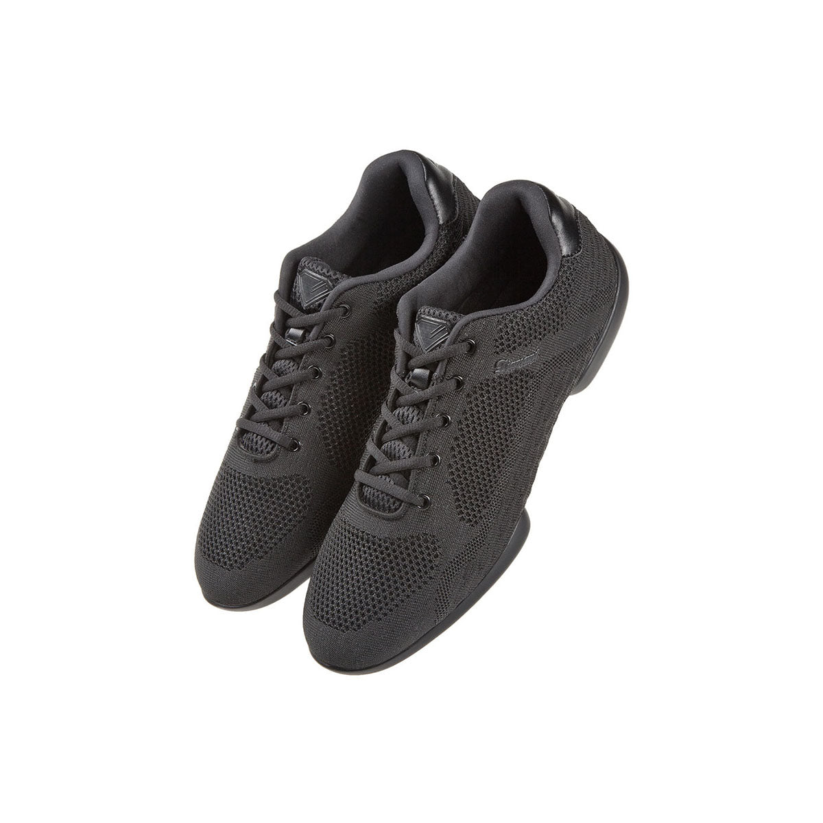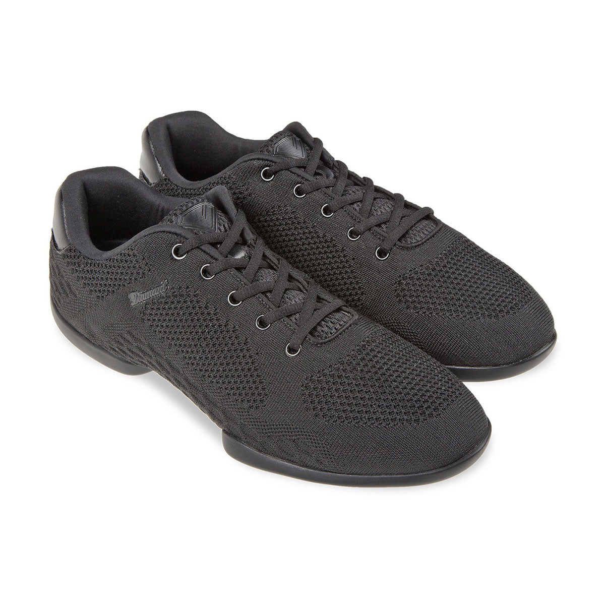 Extrem leichte und bequeme Diamant Split-Sole Dance Sneakers unisex mit 5-Loch Schnürung. Dieser Dance Sneaker in der Weite G (normal) wird mit einer geteilten PU Sneaker Sohle mit Spin Points gefertigt. Als Innenfutter wird atmungsaktives und Feuchtigkeit absorbierendes Microfaser verwendet. Das das Obermaterial aus gestricktem Mesh schwarz ist ein hochwertiges Funktionsgewebe.