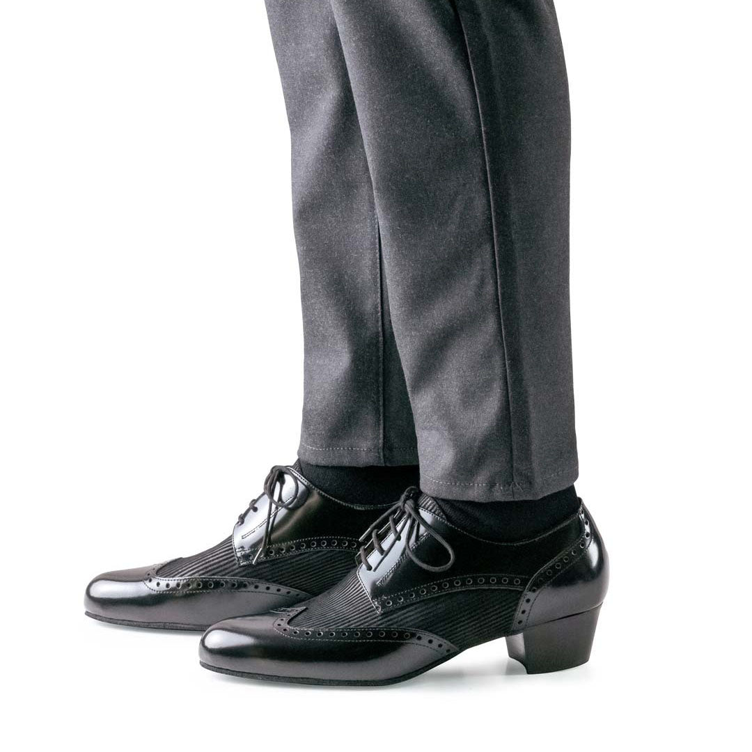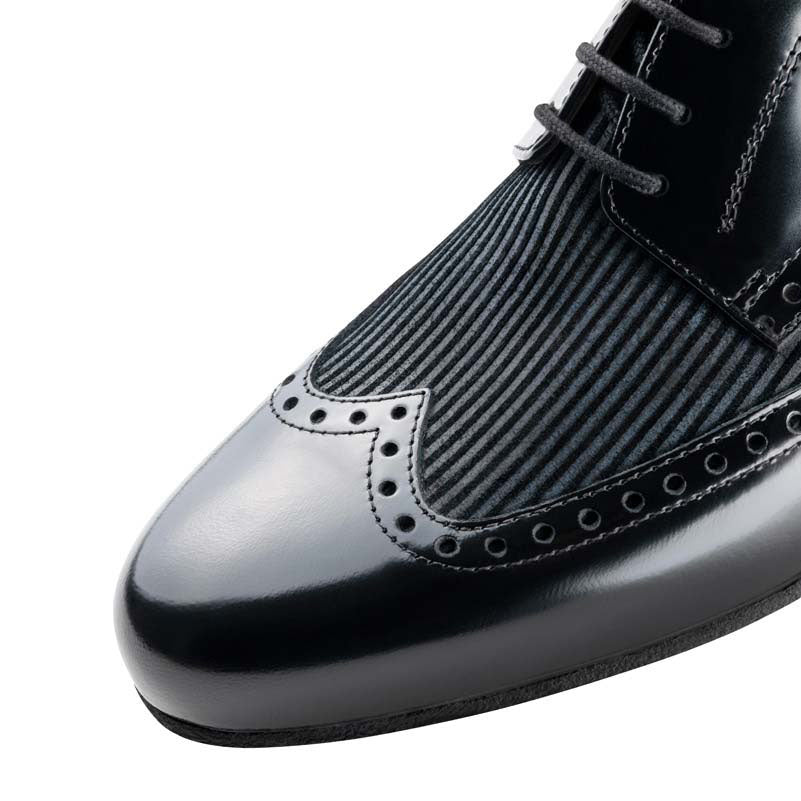 Exklusiver und fantastisch bequemer Nueva Epoca Herren Tanzschuh von Werner Kern mit einer unverwechselbaren Kombination aus schwarzem Lamm Nappaleder (Echtleder) mit hochwertigen streifen Velour. Durch das passformgerechte Design in Verbindung mit der bequemen vier-Loch Schnürung bietet der Schuh perfekten und bequemen Halt.