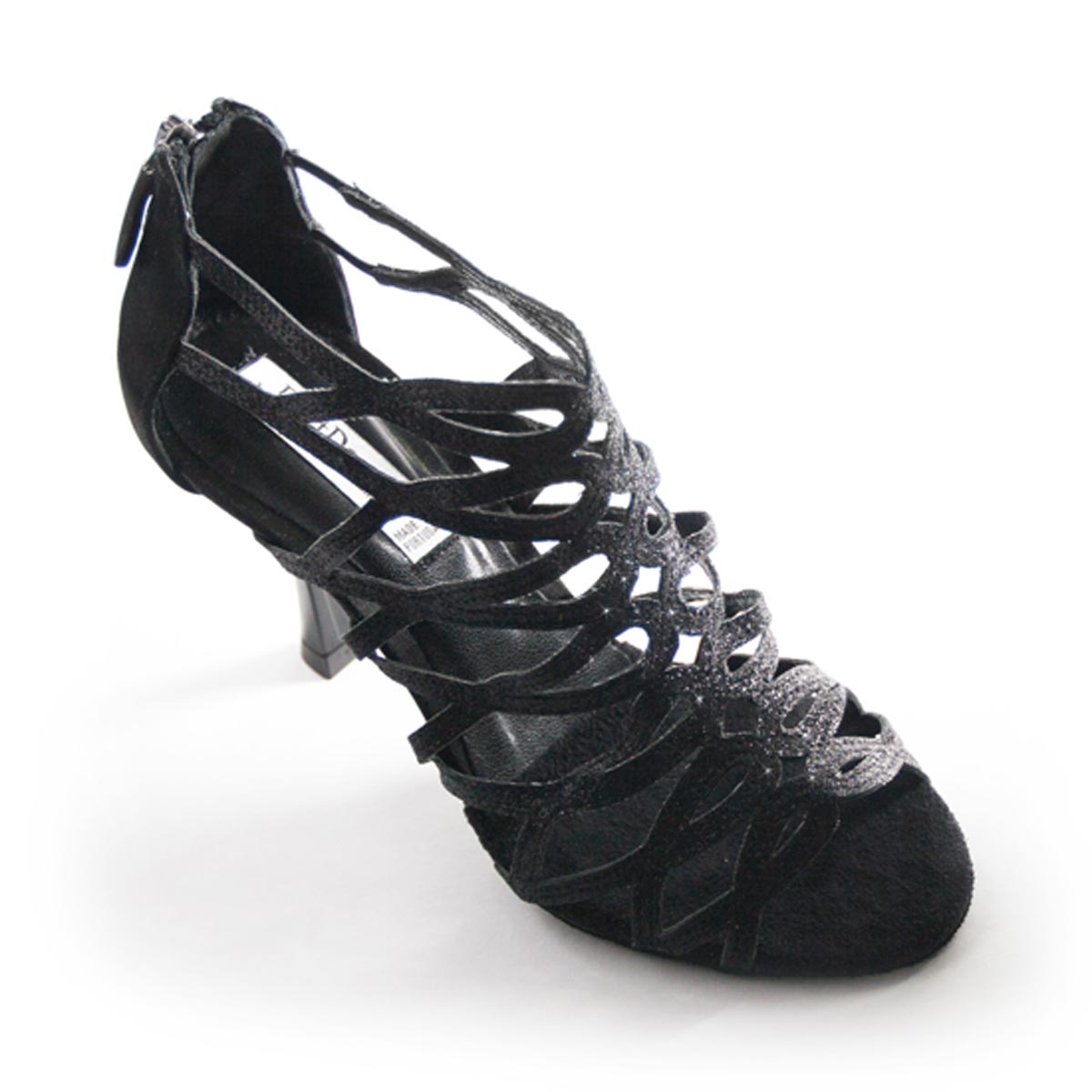 Produktbeschreibung: Extravagante Damen Salsa / Latein Sandalette von PortDance Made in Portugal mit außergewöhnlichem Look. Zahlreiche filigrane Riemchen garantieren einen perfekten Halt beim Tanzen. Für das Obermaterial aus Satin schwarz / Satin schwarz mit Glitter werden hochwertige Materialen verwendet. Diese Latein- / Salsaschuhe werden in Normalweite mit 7 cm Flare (klein) Absatz produziert.