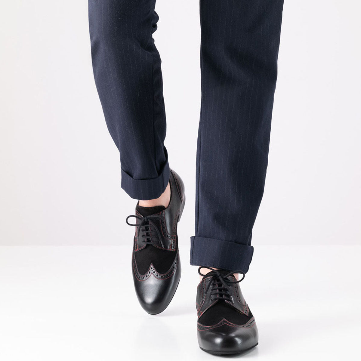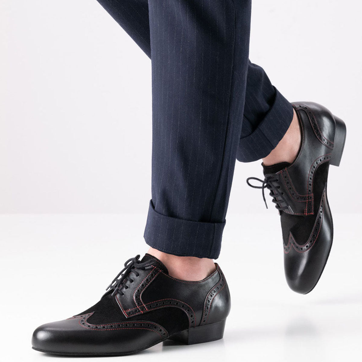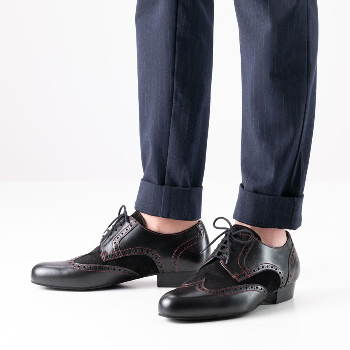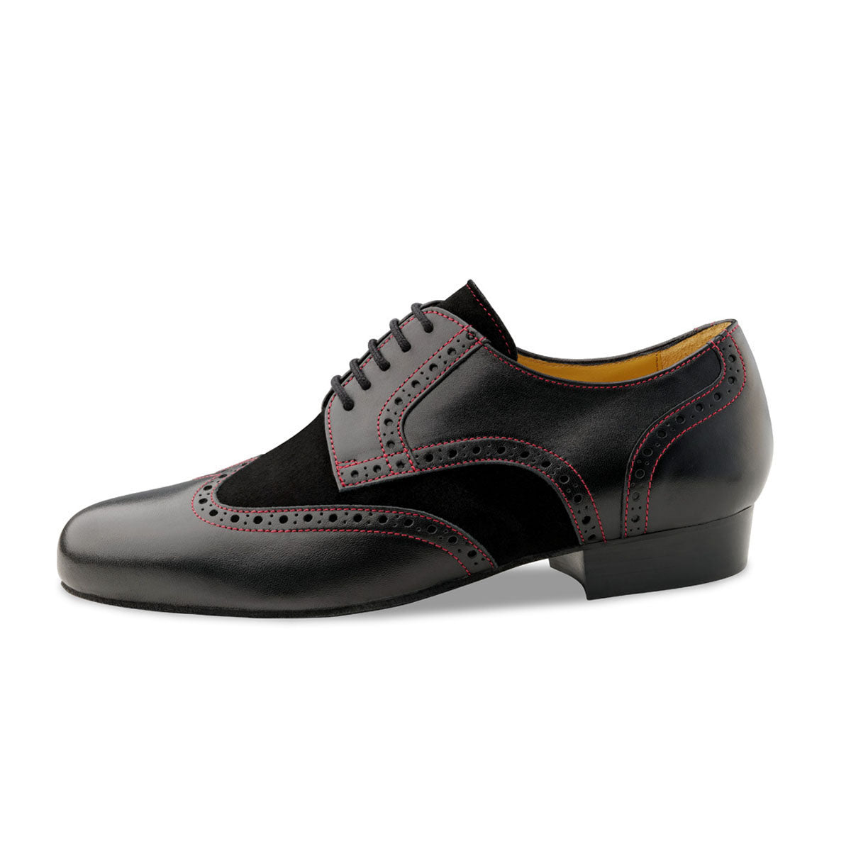 Trapani von Werner Kern – der eleganter Vollleder Herrentanzschuh für stilbewusste Tänzer. Dieses Modell vereint schwarzes Nappaleder und weiches Velourleder zu einem unvergleichlich edlen Look. Die feinen roten Nähte und die klassischen Brogue-Details verleihen Trapani eine raffinierte Note, die jeden Ihrer Tanzschritte unterstreicht. Der leicht erhöhte und abgeschrägte Absatz gibt dem Fuß zusätzlich einen bequemen Stand.