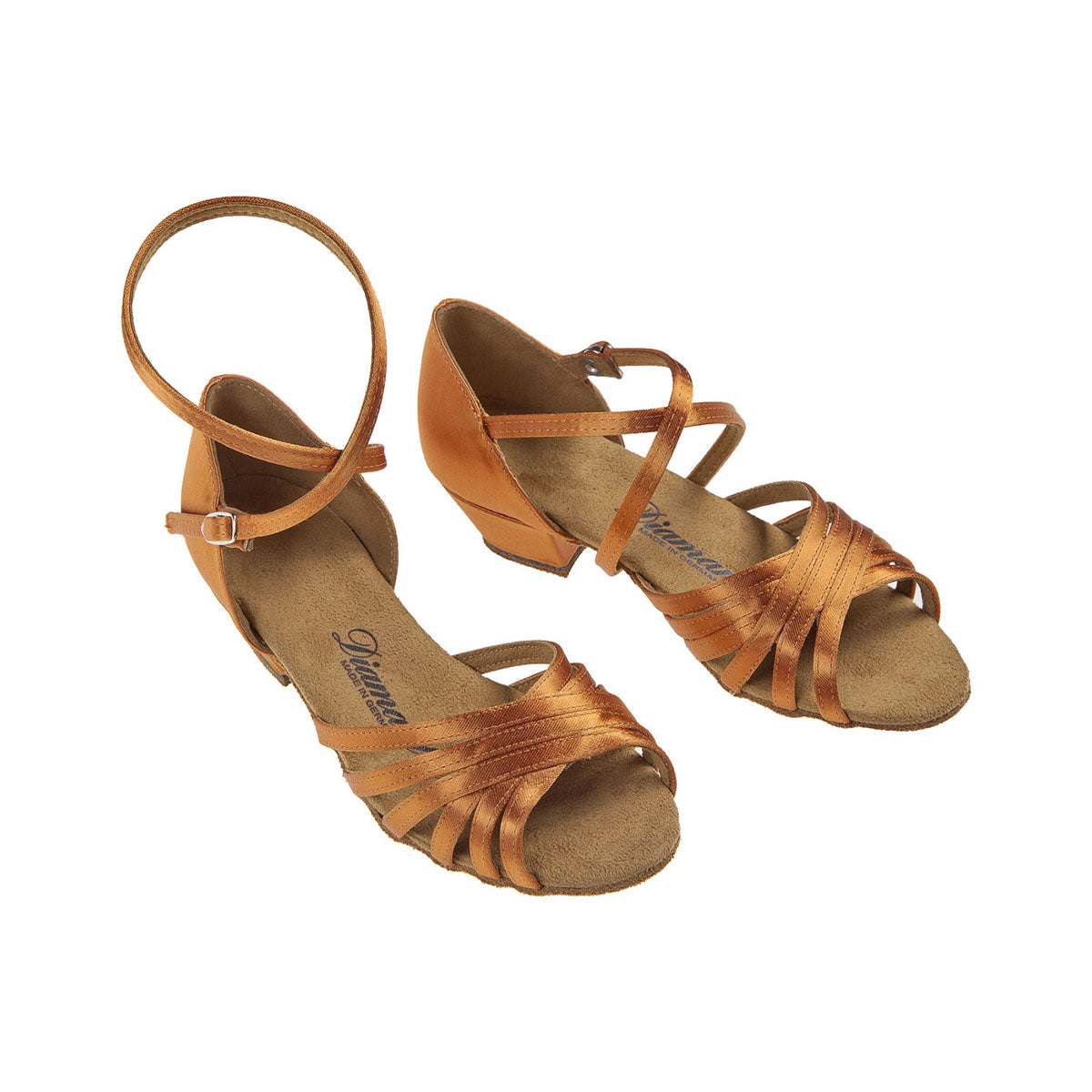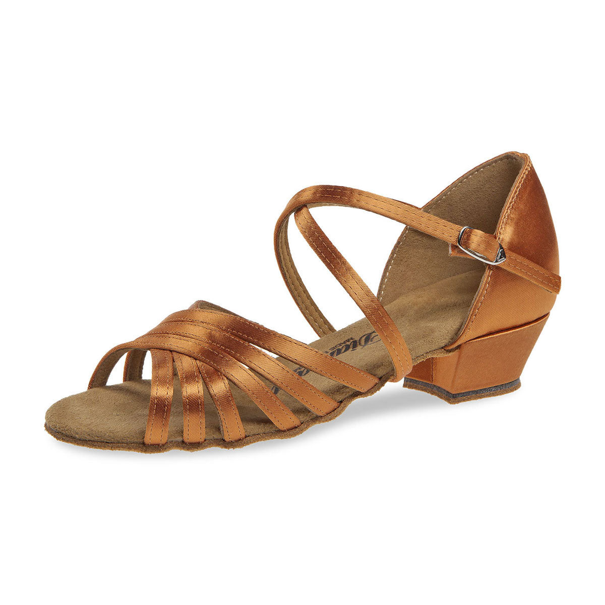 Produktbeschreibung: Diamant Mädchen Tanzschuhe Made in Germany handgefertigt mit einem Vorderblatt aus sechs zu einem Netz vernähten Riemchen die sich dem Fuß anpassen. Die zehenoffene Sandalette wird mit einer stufenlos einstellbaren Druckknopfschnalle zum schnellen Öffnen und Schließen an einem Fersenriemchen gefertigt, welches entweder unter dem Fuß oder um den Unterschenkel verlaufen kann. Dieser Kindertanzschuh für Mädchen wird mit einem Schock absorbierenden 2,5 cm Block Absatz hergestellt. Als Innenauskleidung wird ein atmungsaktives und Feuchtigkeit absorbierendes Microfaser aus italienischer Premium-Herstellung eingearbeitet. für das Obermaterial aus dark tan Satin wird erstklassiger Stoff aus England verwendet.