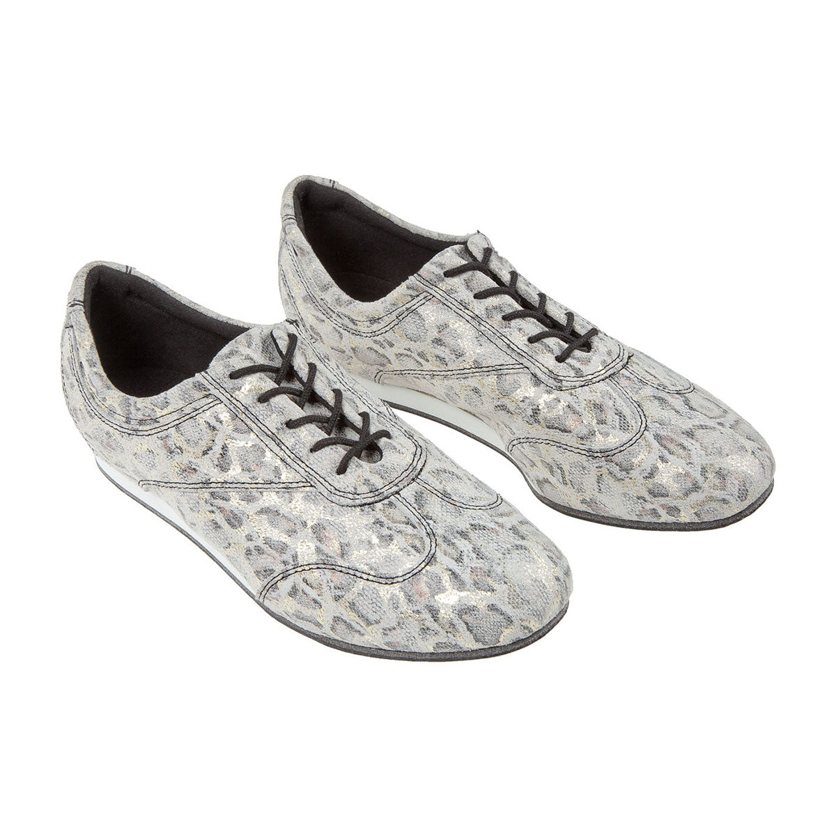 Produktbeschreibung: Sehr leichter Damen Trainer Tanzschuh in modernem Turnschuhdesign. Der geschlossene Schnürschuh wird mit einer 5-Loch Schnürung und mit weicher Schaftrandpolsterung gefertigt. Dieser Dance Sneaker in der Weite F (Normal) wird mit einem durchgehenden und sehr leichtem Absatzkeil gefertigt. Als Innenauskleidung wird ein atmungsaktives und Feuchtigkeit absorbierendes Microfaser aus italienischer Premium-Herstellung eingearbeitet. Für das Obermaterial aus Schneeleopard Gold print Velourleder wird ein weiches Velourleder mit edlem Leopard Aufdruck und Goldfolierung aus Italien verwendet.