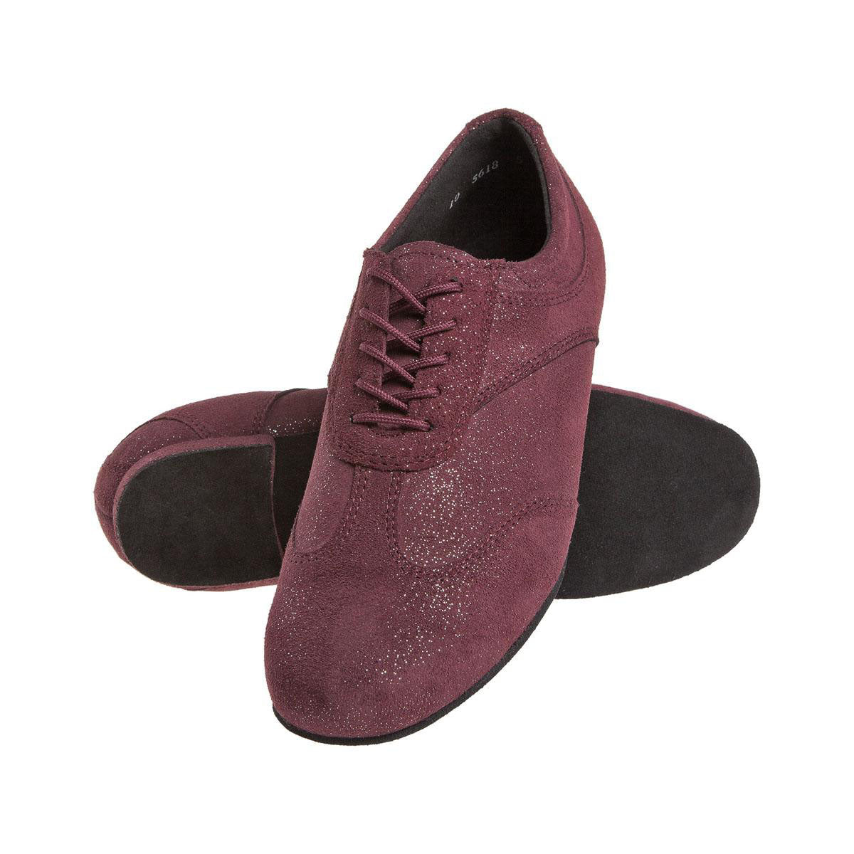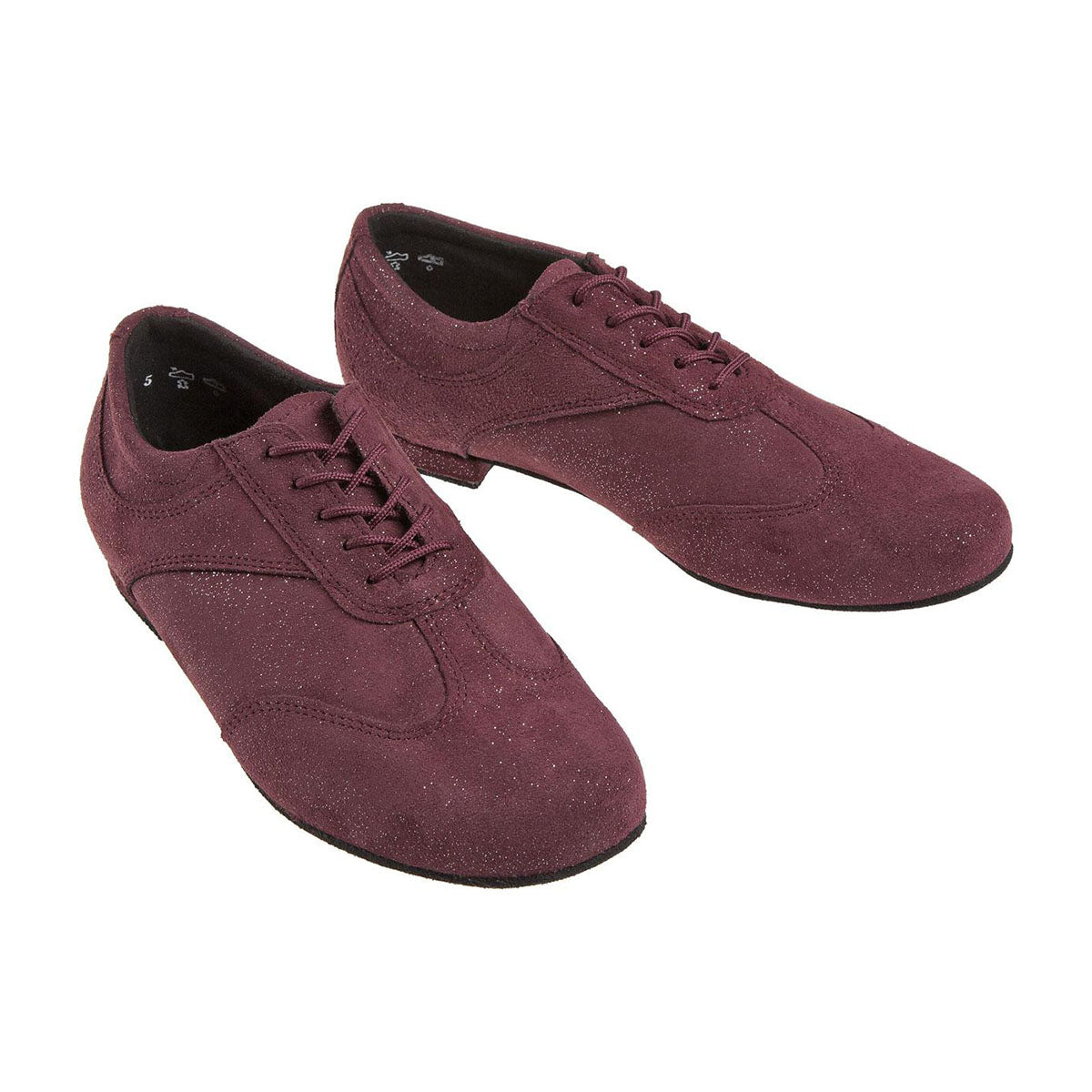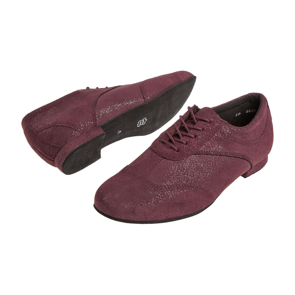 Diamant Damen Tanzschuhe / Trainerschuhe Made in Germany handgefertigt in modernem Sneaker Design. Der geschlossene Schnürschuh wird mit einer 5-Loch Schnürung und mit weicher Schaftrandpolsterung gefertigt. Dieser Tanzschuh mit runder Vorderkappe wird in der Weite F (Normalweite) mit einem standfesten 1,2 cm Block Absatz mit sehr großer Auftrittsfläche hergestellt. Als Innenauskleidung wird ein atmungsaktives und Feuchtigkeit absorbierendes Microfaser aus italienischer Premium-Herstellung eingearbeitet. Für das Obermaterial aus Veloursleder Bordeaux Silber Reflex wird ein weiches Premiumleder aus Italien verwendet.