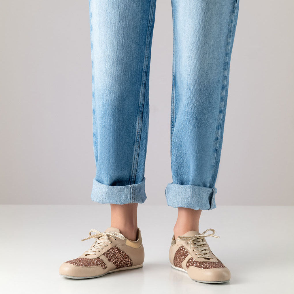 Entdecken Sie den funkelnden Street-Style mit unserem Tanzsneaker Honey von Werner Kern! Dieser Sneaker bringt Glanz und Glamour direkt auf die Tanzfläche und zieht alle Blicke auf sich. Hergestellt aus hochwertigem Nappaleder in elegantem Beige und kombiniert mit glitzerndem Brokat in Roségold, bietet Honey die perfekte Kombination aus Eleganz und modernem Chic. Die gepolsterte Innensohle gewährleistet ein bequemes Tragegefühl – selbst bei langen Tanznächten. Honey ist der perfekte Schuh für alle, die ihre Leidenschaft fürs Tanzen mit einem lässigen, urbanen Look verbinden möchten.