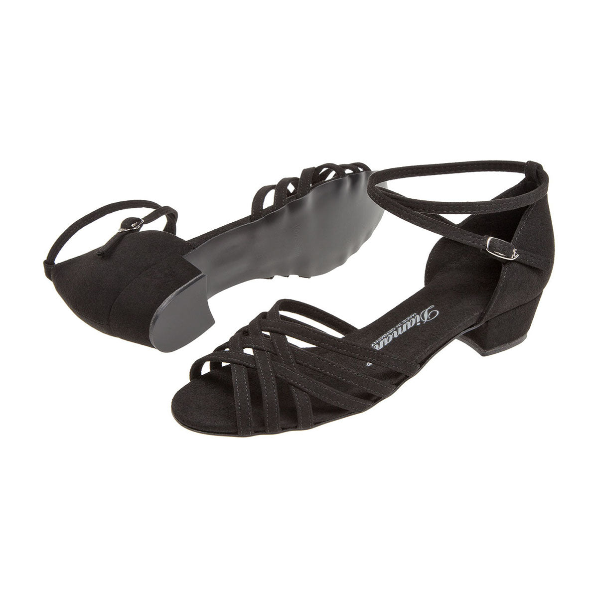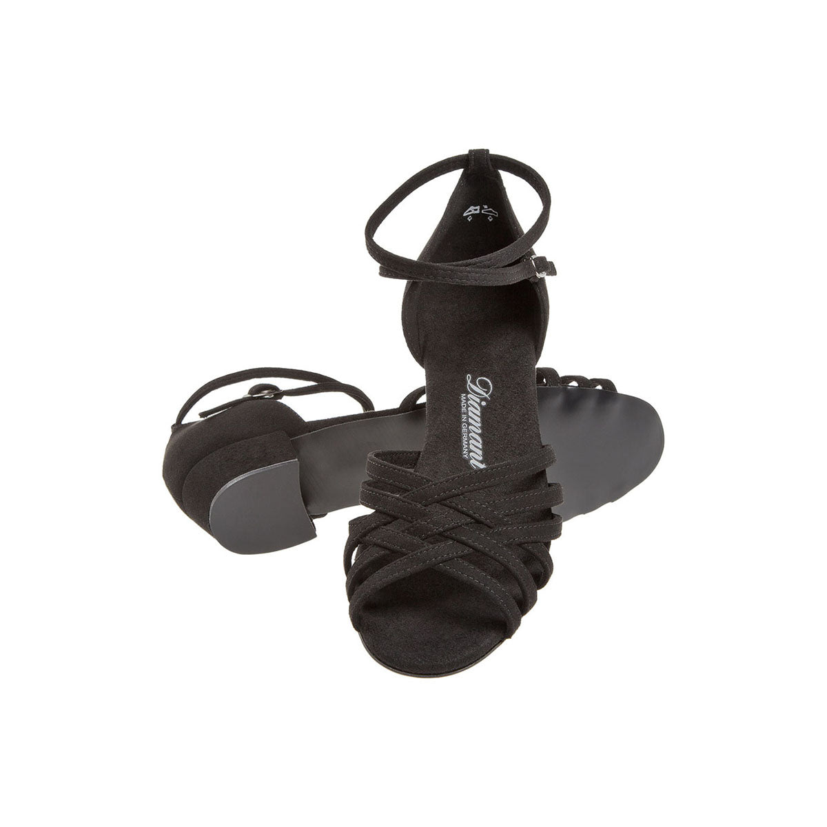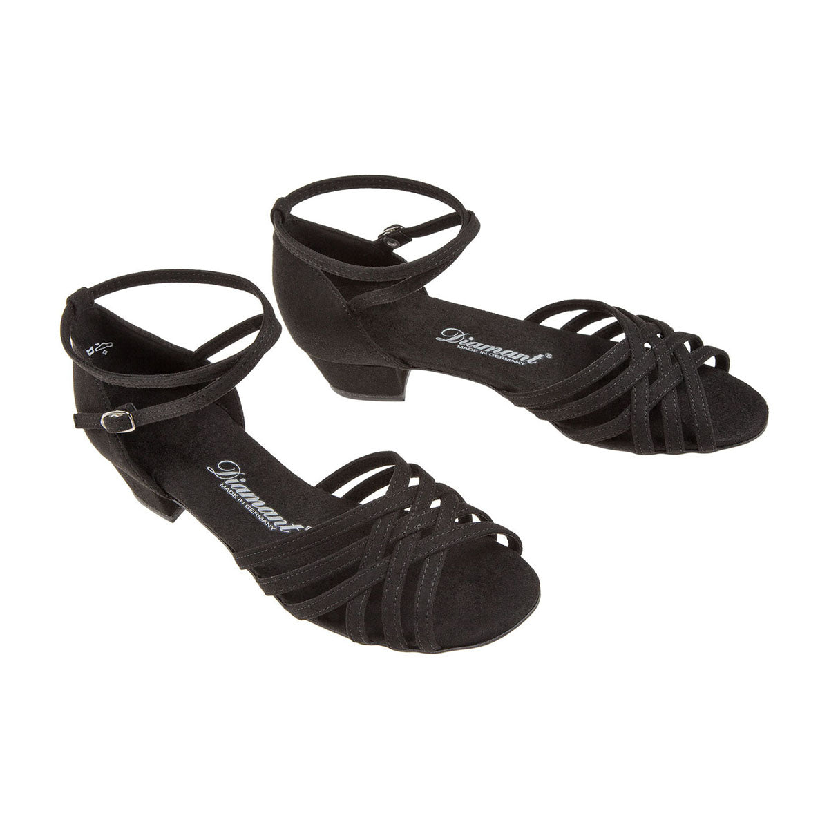 Diamant Damen Latein Tanzschuhe Made in Germany handgefertigt mit einem Vorderblatt aus sechs zu einem Netz vernähten Riemchen die sich dem Fuß anpassen. Die zehenoffene Sandalette wird mit einer stufenlos einstellbaren Druckknopfschnalle zum schnellen Öffnen und Schließen an einem überkreuzenden Fersenriemchen gefertigt. Dieser Tanzschuh mit runder Vorderkappe wird in der Weite F (Normalweite) mit einem standfesten 2,8 cm Block Absatz mit sehr großzüiger Auftrittsfläche hergestellt. Als Innenauskleidung wird ein atmungsaktives und Feuchtigkeit absorbierendes Microfaser aus italienischer Premium-Herstellung eingearbeitet. für das Obermaterial aus Microfaser schwarz wird ein äußerst pflegeleichtes, hochwertiges Microfaser aus italienischer Premium-Herstellung verwendet.