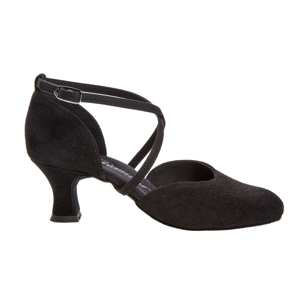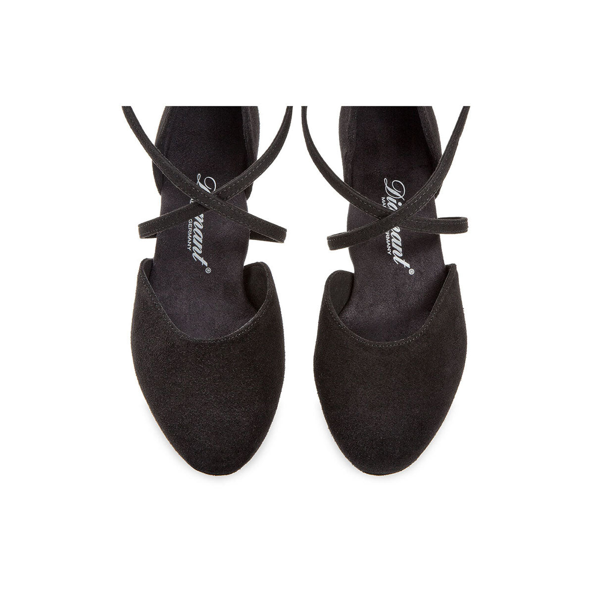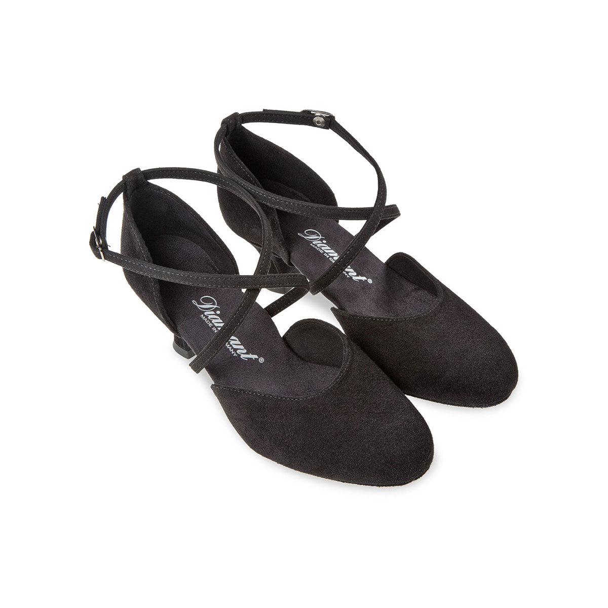 Diamant Damen Standard Tanzschuhe Made in Germany handgefertigt in klassischer Ausführung mit Rundausschnitt. Der zehengeschlossene Pumps wird mit einer stufenlos einstellbaren Druckknopfschnalle zum schnellen Öffnen und Schließen an einem überkreuzenden Fersenriemchen gefertigt. Dieser Tanzschuh wird in der Weite H für breite Füße mit Diamant Comfort Fußbett und einem standfesten 5,5 cm Spanish Absatz mit großer Auftrittsfläche hergestellt. Als Innenauskleidung wird ein atmungsaktives und Feuchtigkeit absorbierendes Microfaser aus italienischer Premium-Herstellung eingearbeitet. Für das Obermaterial aus schwarz Velourleder wird ein weiches Velour aus Italien verwendet.