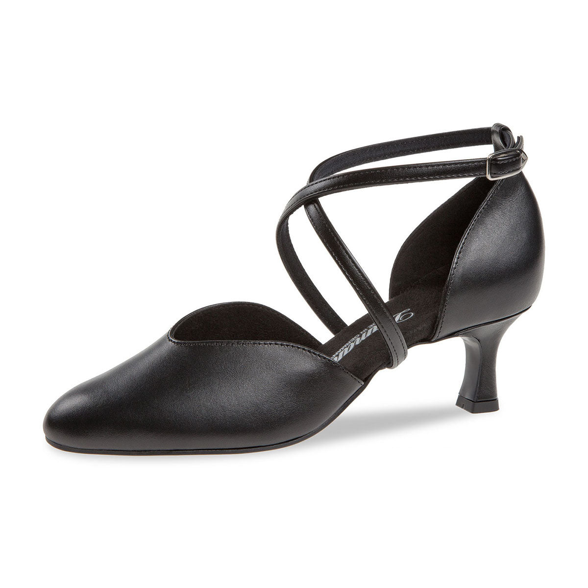 Diamant Damen Salsa/Tango Tanzschuhe Made in Germany handgefertigt mit abgerundentem V-Ausschnitt. Der zehengeschlossene Pumps wird mit einer stufenlos einstellbaren Druckknopfschnalle zum schnellen Öffnen und Schließen an einem überkreuzenden Fersenriemchen gefertigt. Dieser Tanzschuh wird in der Weite E1/2 (Normalweite) mit einem eleganten 5 cm Flare Absatz hergestellt. Als Innenauskleidung wird ein atmungsaktives und Feuchtigkeit absorbierendes Microfaser aus italienischer Premium-Herstellung eingearbeitet. Für das Obermaterial aus Echtleder schwarz wird ein hochwertiges Rindnappaleder aus Italien verwendet.