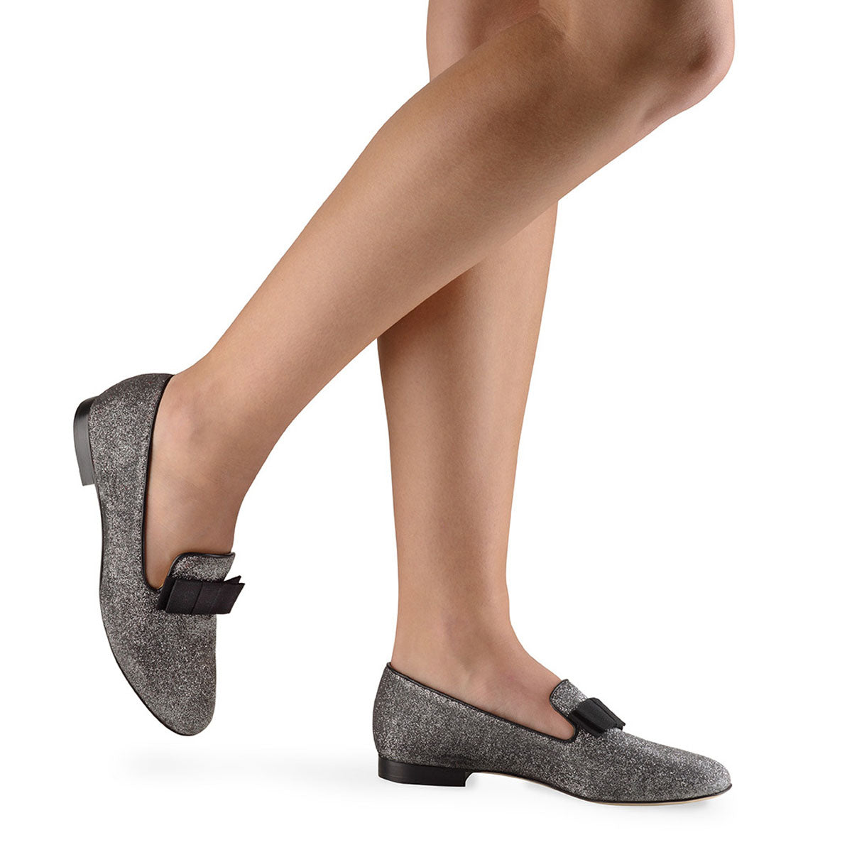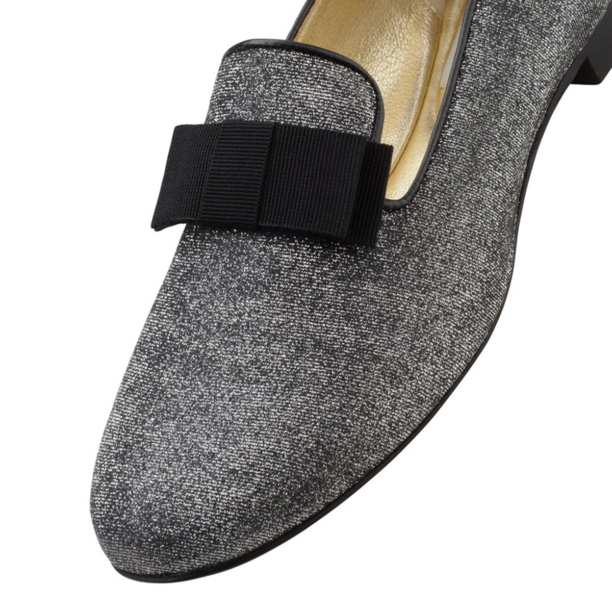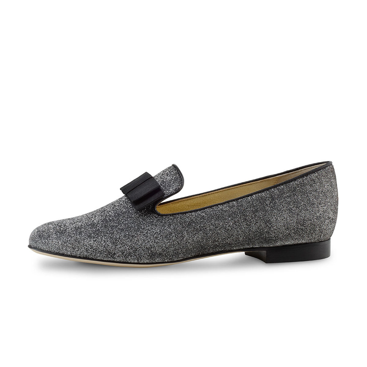 Produktbeschreibung: Dank diesem Ballerina (Loafer) kannst du auch mal bewusst auf höhere Absätze am Abend verzichten. Seinen extravaganten Charakter erhält das Modell durch seine typische Silhouette in Kombination mit feinstem englischen Brokat in Schwarz und Silber. Perfekt abgerundet wird das flache Paar durch den feinen Ledereinfaß und die charakteristische Loafer Schleife. Gefertigt wurde das Paar mitten in der Toskana. Trage das Modell tagsüber um deinen Look aufzuwerten oder am Abend zu Kleidern anstelle von Pumps.