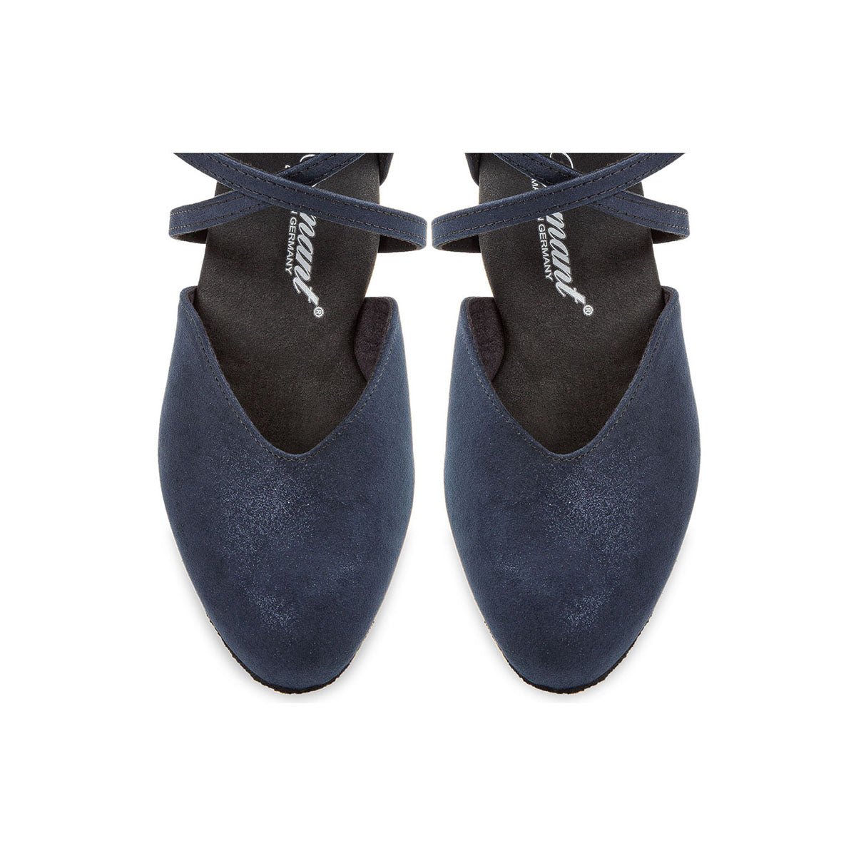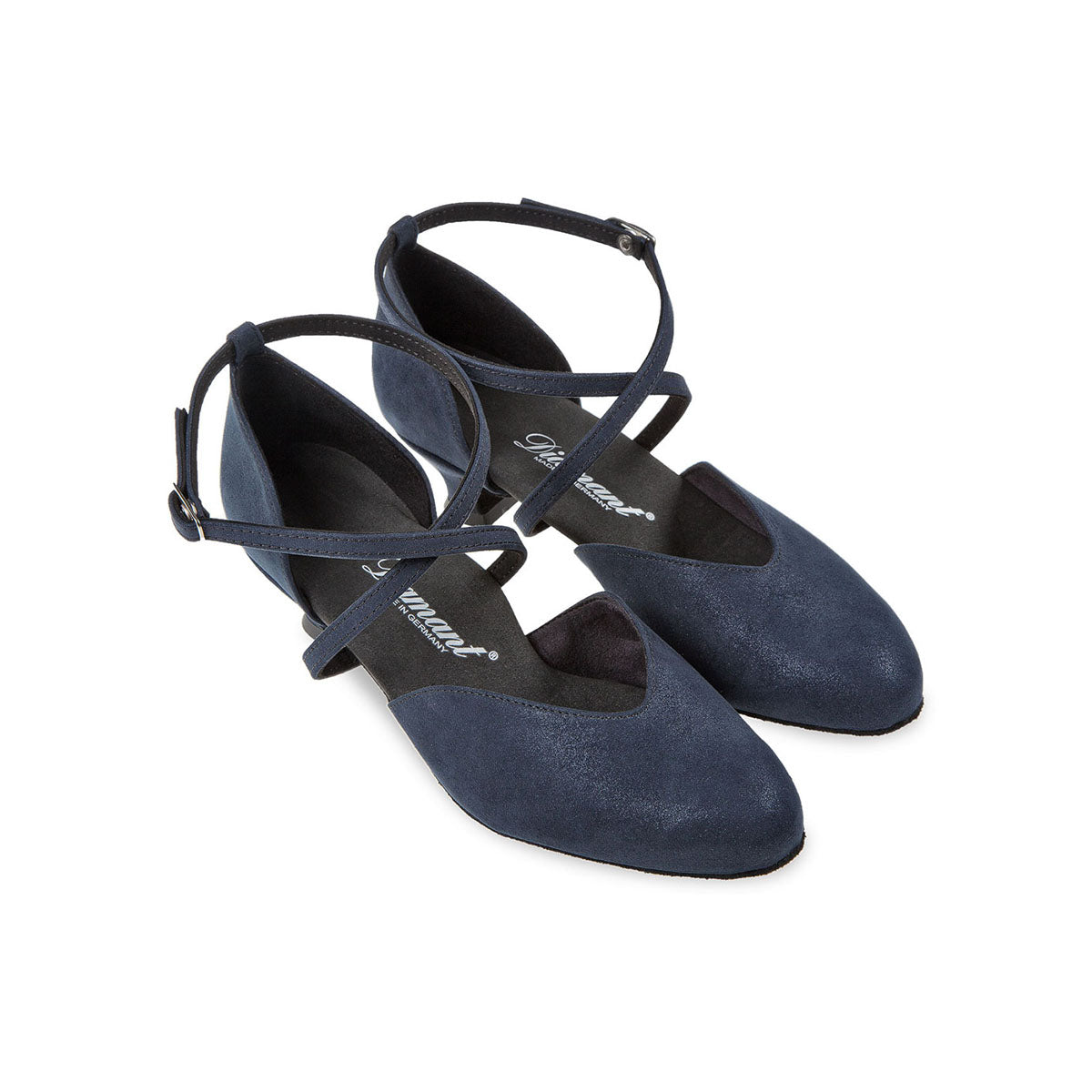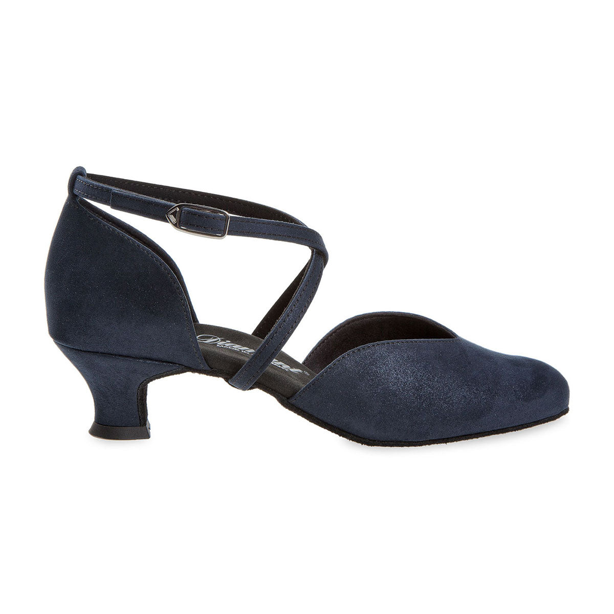 Produktbeschreibung: Diamant Damen Standard Tanzschuhe Made in Germany handgefertigt mit abgerundentem V-Ausschnitt. Der zehengeschlossene Pumps wird mit einer stufenlos einstellbaren Druckknopfschnalle zum schnellen Öffnen und Schließen an einem überkreuzenden Fersenriemchen gefertigt. Dieser Tanzschuh wird in der Weite E½ (Normalweite) mit Diamant Comfort Fußbett und einem standfesten 4,2 cm Spanish Absatz mit großer Auftrittsfläche hergestellt. Als Innenauskleidung wird ein atmungsaktives und Feuchtigkeit absorbierendes Microfaser aus italienischer Premium-Herstellung eingearbeitet. Für das Obermaterial aus Mitternachtsblau Samtreflex wird ein weiches Samt mit dezenter Silberveredelung aus Italien verwendet.