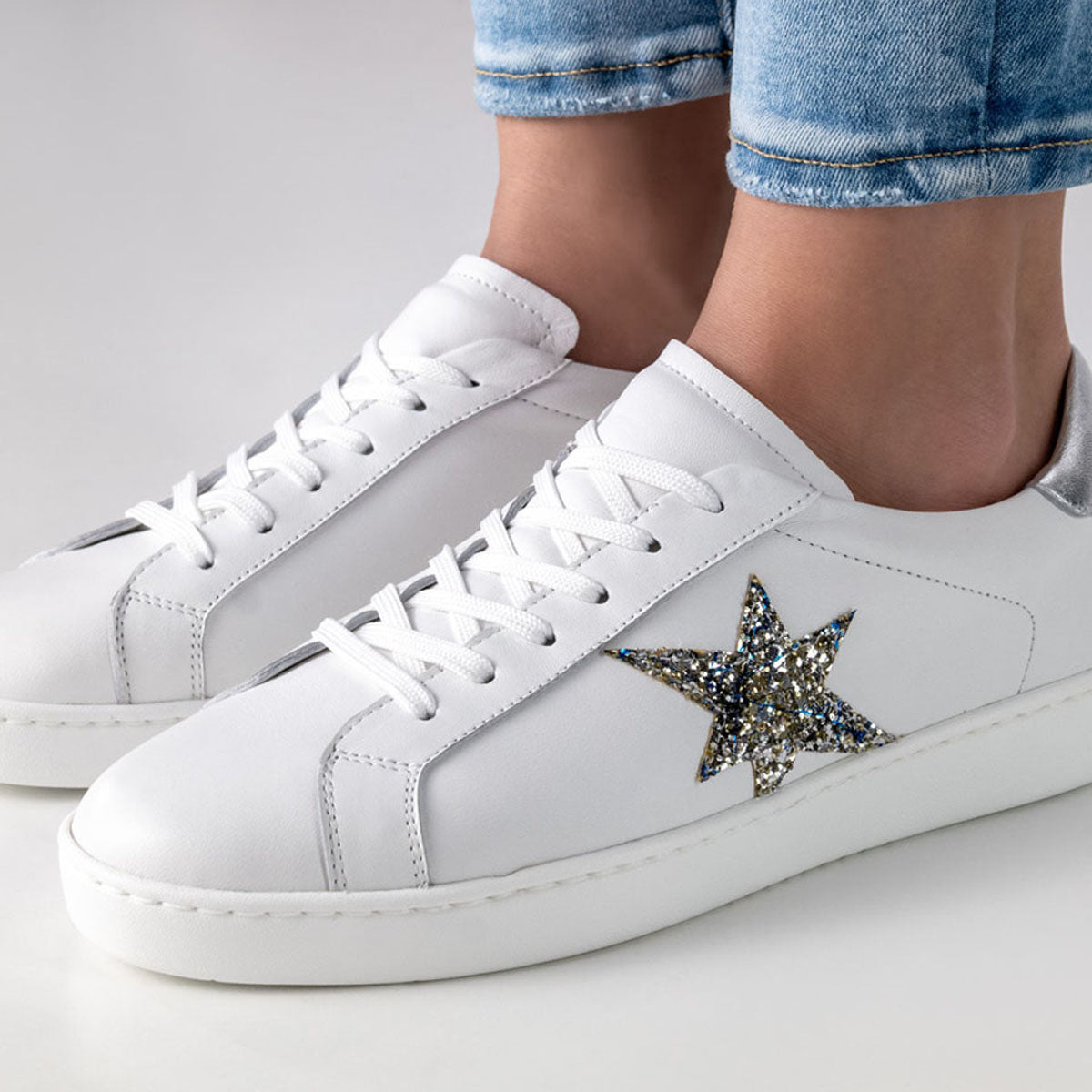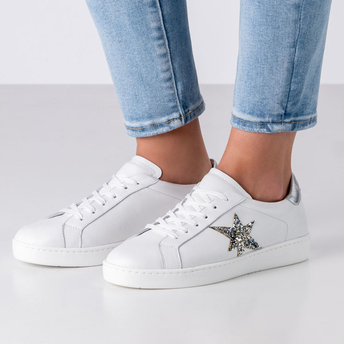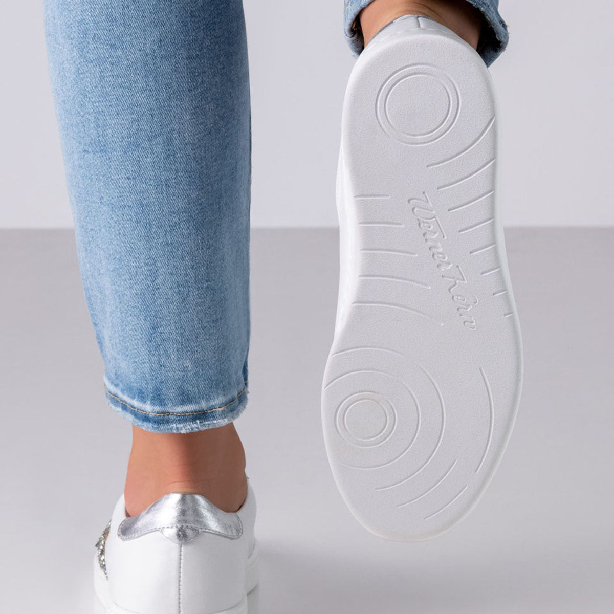 Stark im Auftritt – leicht am Fuß. Der Tanzsneaker Heaven von Werner Kern bringt Urban-Chic auf die Tanzfläche. Aus weißem Nappaleder gefertigt, besticht er durch ein asymmetrisches Stern-Detail aus silberfarbenem Brokat und eine glänzende Fersenkappe in Nappa. Die PU-Sohle mit zwei Drehpunkten sorgt für leichtes Drehen – egal ob auf dem Tanzparkett oder Outdoor. Handgefertigt in Italien, steht Heaven für exzellente Verarbeitung, feine Materialien und modernes Design – für alle, die beim Tanzen auf Stil und Qualität setzen.