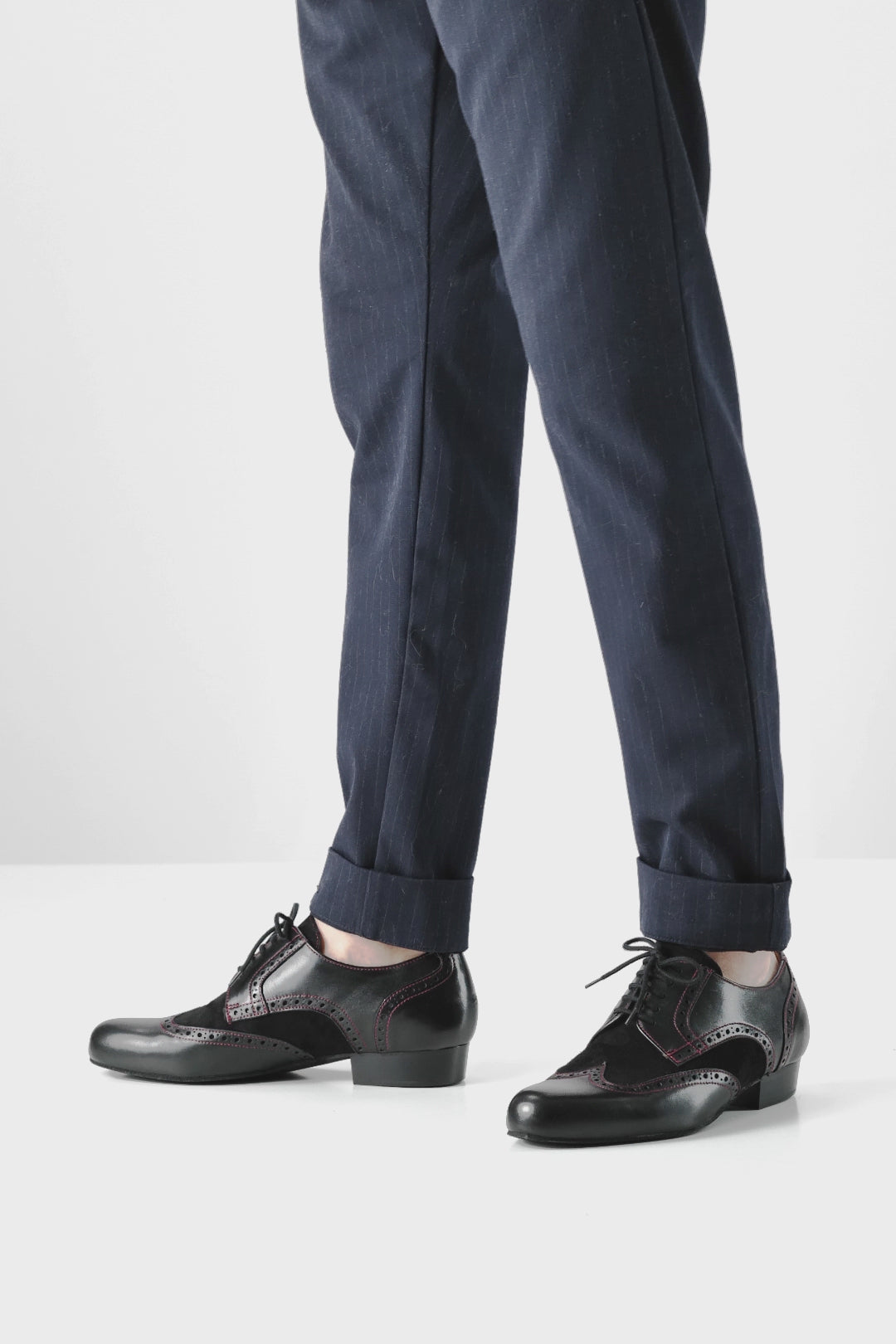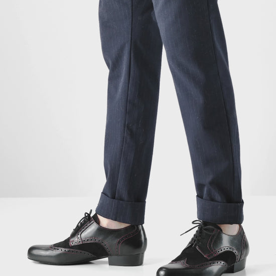Trapani von Werner Kern – der eleganter Vollleder Herrentanzschuh für stilbewusste Tänzer. Dieses Modell vereint schwarzes Nappaleder und weiches Velourleder zu einem unvergleichlich edlen Look. Die feinen roten Nähte und die klassischen Brogue-Details verleihen Trapani eine raffinierte Note, die jeden Ihrer Tanzschritte unterstreicht. Der leicht erhöhte und abgeschrägte Absatz gibt dem Fuß zusätzlich einen bequemen Stand.