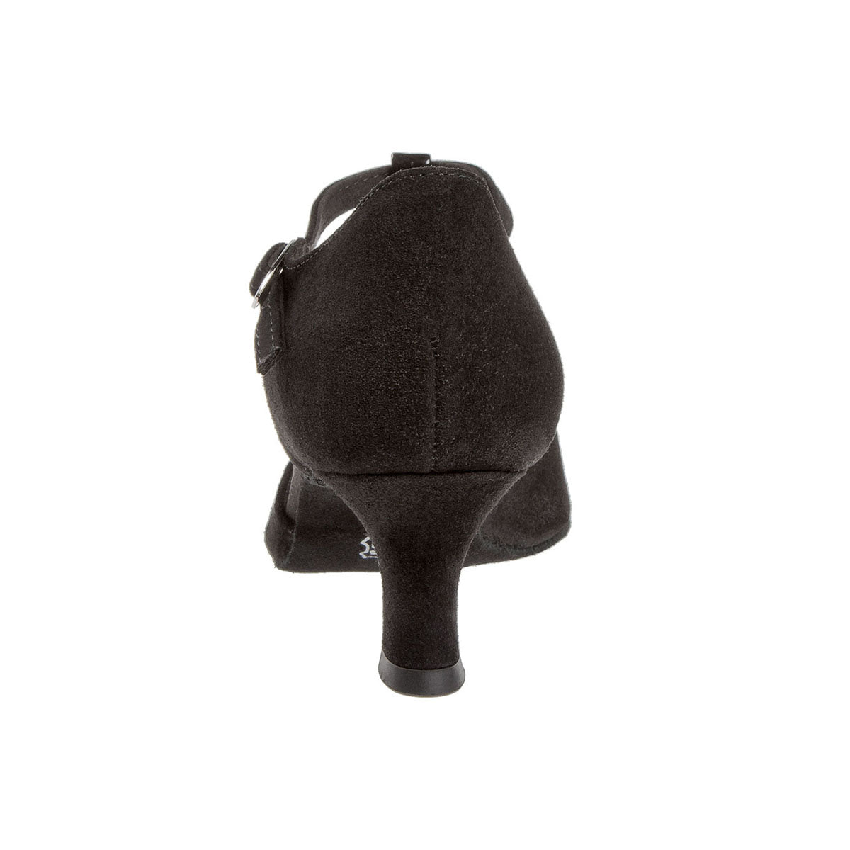 Damen Tanzschuhe Made in Germany handgefertigt mit einem wellenförmig in das Vorderblatt übergehenden T-Steg. Der zehengeschlossene Pumps wird mit einer stufenlos einstellbaren Druckknopfschnalle zum schnellen öffnen und Schließen an einem Fersenriemchen gefertigt. Dieser Tanzschuh wird in der Weite G für kräftige Füße mit einem eleganten 5 cm Latino Absatz hergestellt. Als Innenauskleidung wird ein atmungsaktives und Feuchtigkeit absorbierendes Microfaser aus italienischer Premium-Herstellung eingearbeitet. für die Obermaterialien aus schwarzem Veloursleder kombiniert mit schwarzem Lack werden weiche Materialien höchster Qualität aus Italien verwendet.