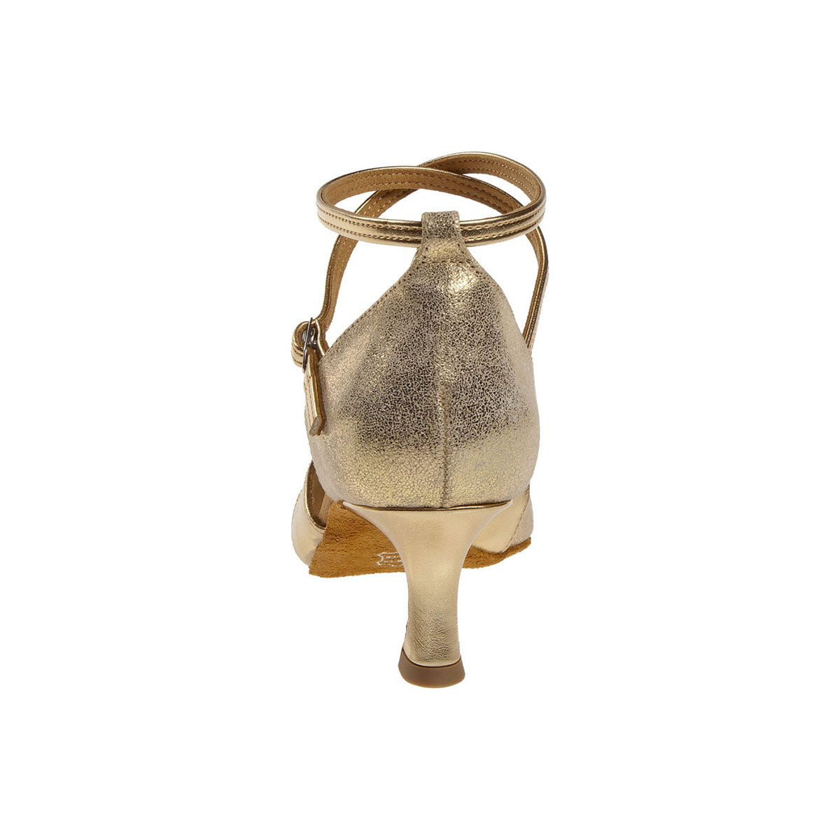 Produktbeschreibung: Damen Latein Tanzschuhe Made in Germany handgefertigt mit einem Vorderblatt aus zwei übereinander liegenden Flügeln die sich dem Fuß anpassen. Die zehenoffene Sandalette wird mit einer stufenlos einstellbaren Druckknopfschnalle zum schnellen Öffnen und Schließen an einem überkreuzenden Fersenriemchen gefertigt. Dieser Tanzschuh wird in der Weite F (Normalweite) mit einem eleganten 5 cm Flare Absatz hergestellt. Als Innenauskleidung wird ein atmungsaktives und Feuchtigkeit absorbierendes Microfaser aus italienischer Premium-Herstellung eingearbeitet. Für das Obermaterial aus goldenem Synthetik kombiniert mit goldenem Velour werden weiche Leder und Materialien höchster Qualität aus Italien verwendet.